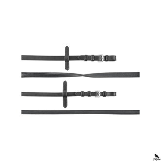 (ETH01000)Dvojité otěže pro drezurní uzdu z kvalitní měkké kůže s přezkami z nerezavějící oceli. Střední část obou otěží je vyrobena z gumy, aby neklouzala a zaručovala bezpečnější úchop.