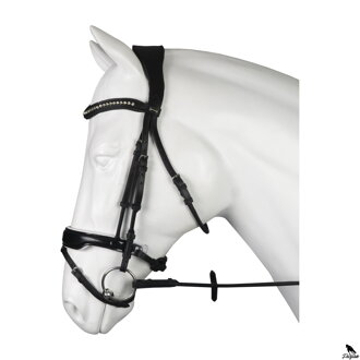 (28002170)Luxusní uzdečka vyrobená z vysoce kvalitní kůže se širokým, měkkým polstrovaným ergonomickým nánosníkem a čelenkou - vlnová forma s AB-krystaly. Slepé spojovací prvky. Včetně pavučinových otěží.