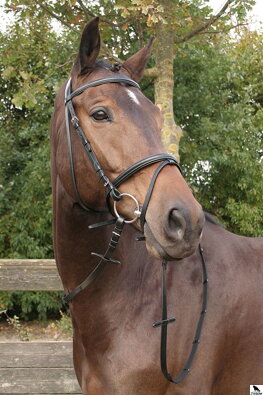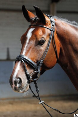 (28000111)Kožená uzda s nízkým nosem, která je ideální pro mladé koně v tréninku. S měkkým polstrováním a materiálem z nerezavějící oceli. Včetně opratů.