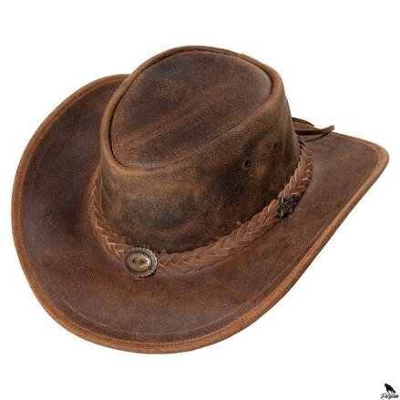 (CRAZY HORSE)Cool westernový klobouk z voskované hnědé štípenky. Páska na klobouk se skládá ze zapletených kožených řemínků, které jsou vpředu a vzadu zaoblené sladěnou lasturou. Příjemné pohodlí při nošení díky měkkému vnitřnímu pásku. S nastavitelnou kravatou z kůže.